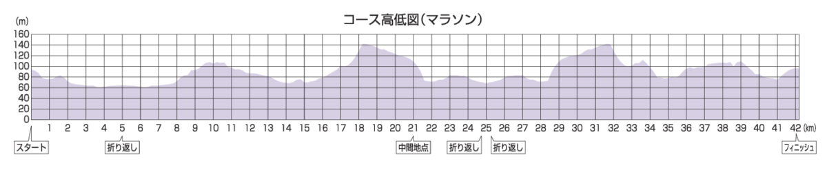 実際奈良マラソンの高低差を調べてみると、こんな感じとなっています。
