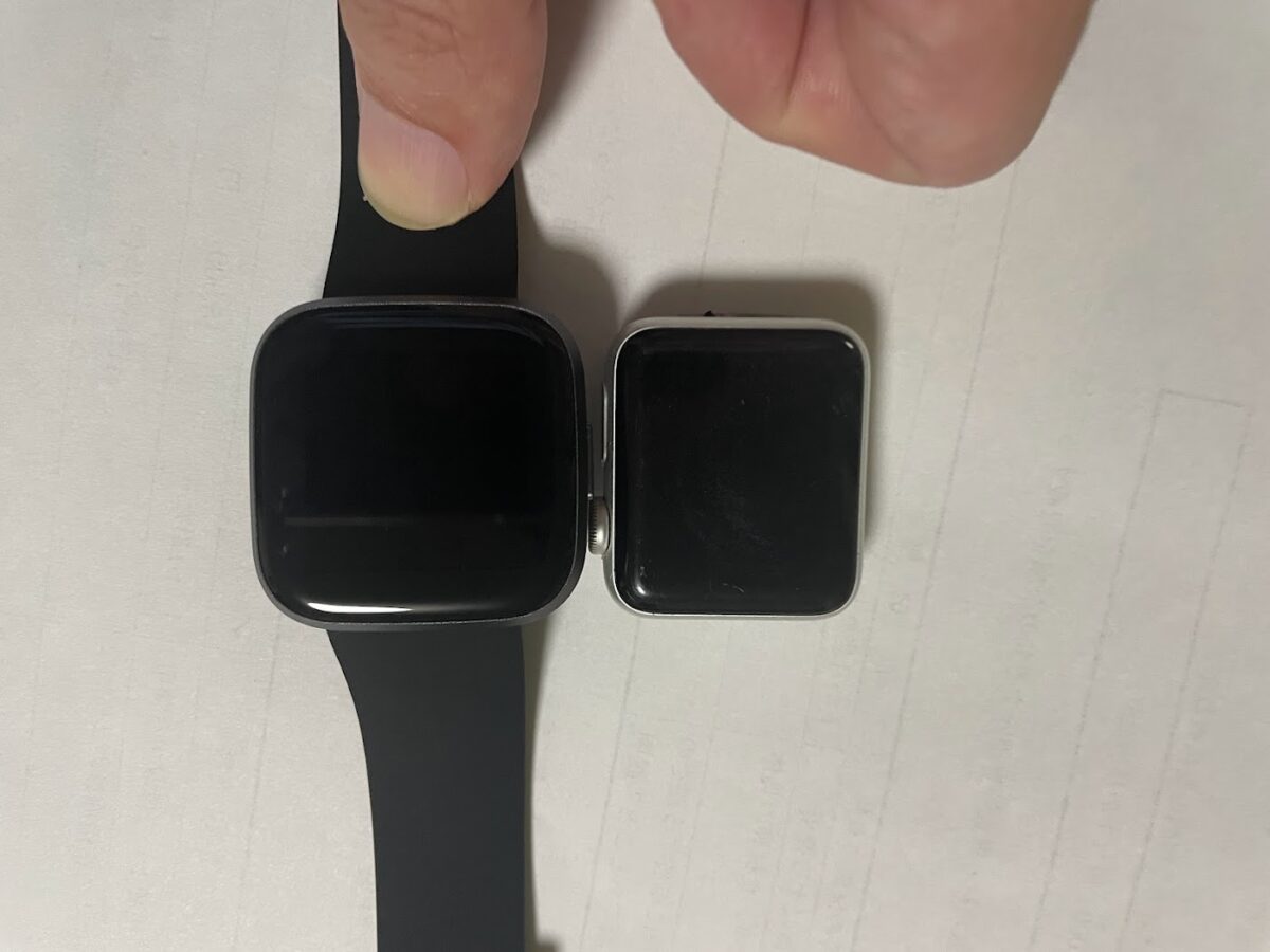 早速封を開けてAppleWatch3とサイズを比べてみると、縦幅は一緒くらい、横幅はFitbit Versa2の方がかなり広めでした。