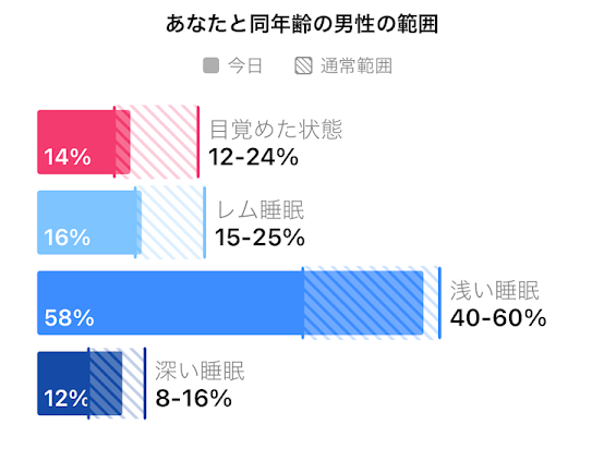 さらに同年齢の男性の平均値との比較も出てくるのですが、この睡眠の質を見る限り、どの数値も平均値レベルといったところで、睡眠の質についてはそれほど問題なさそうな気が・・・