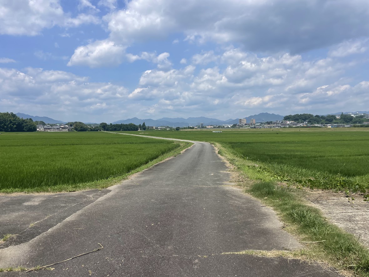 道中ではかなり見晴らしのいい広大な田んぼが広がっていたりしたのですが、笑えないレベルで気温が上がる中、木陰らしい木陰は全くと言っていいほどなく。