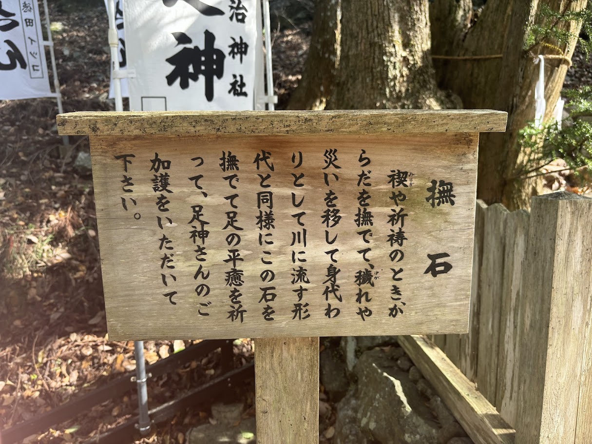 足神さんには撫石という石があり、この石を撫でながら足の平癒を祈ると神様のご加護があるという言い伝えがあるという事で、実際に石を撫でながら日頃の感謝とともに、この夏に肉離れを繰り返している左ふくらはぎの平癒を祈願。