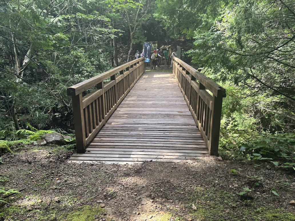 結局その後も、全くきつい個所はなく、道に迷う心配も全くなく、ひたすらゆるい下り坂を歩き進めていき、峠をスタートしてちょうど2㎞程のところで三浦峠最大の見どころと言われる総ヒノキ造りの熊ヶ谷橋に到着。