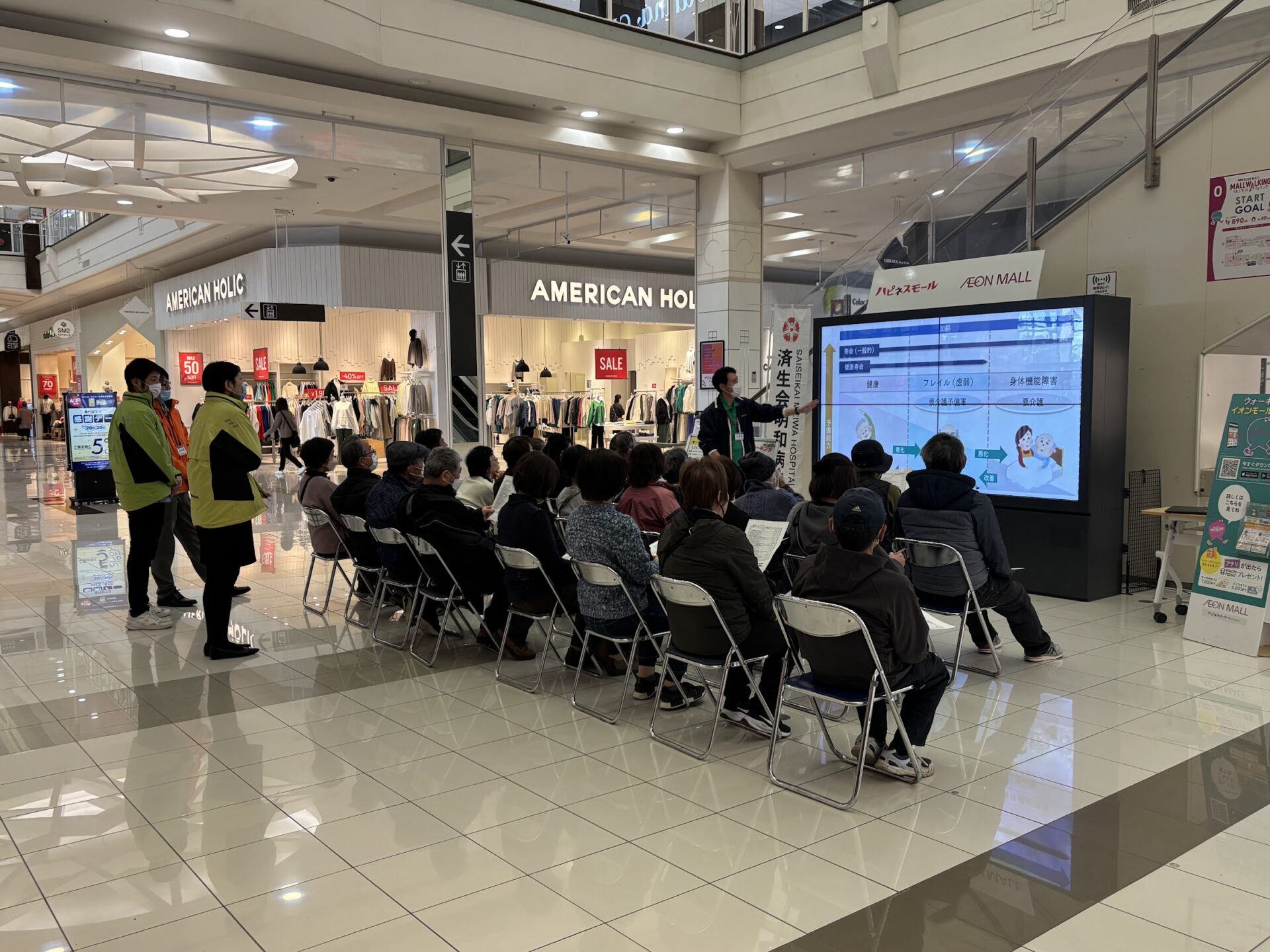 私の方でレクチャー→ウォーミングアップ→店内のウォーキング→クールダウンの流れで実施させていただいたあと、済生会明和病院さんより健康についてのレクチャー、今回のテーマは「フレイル」についてお話いただく流れで実施しました。