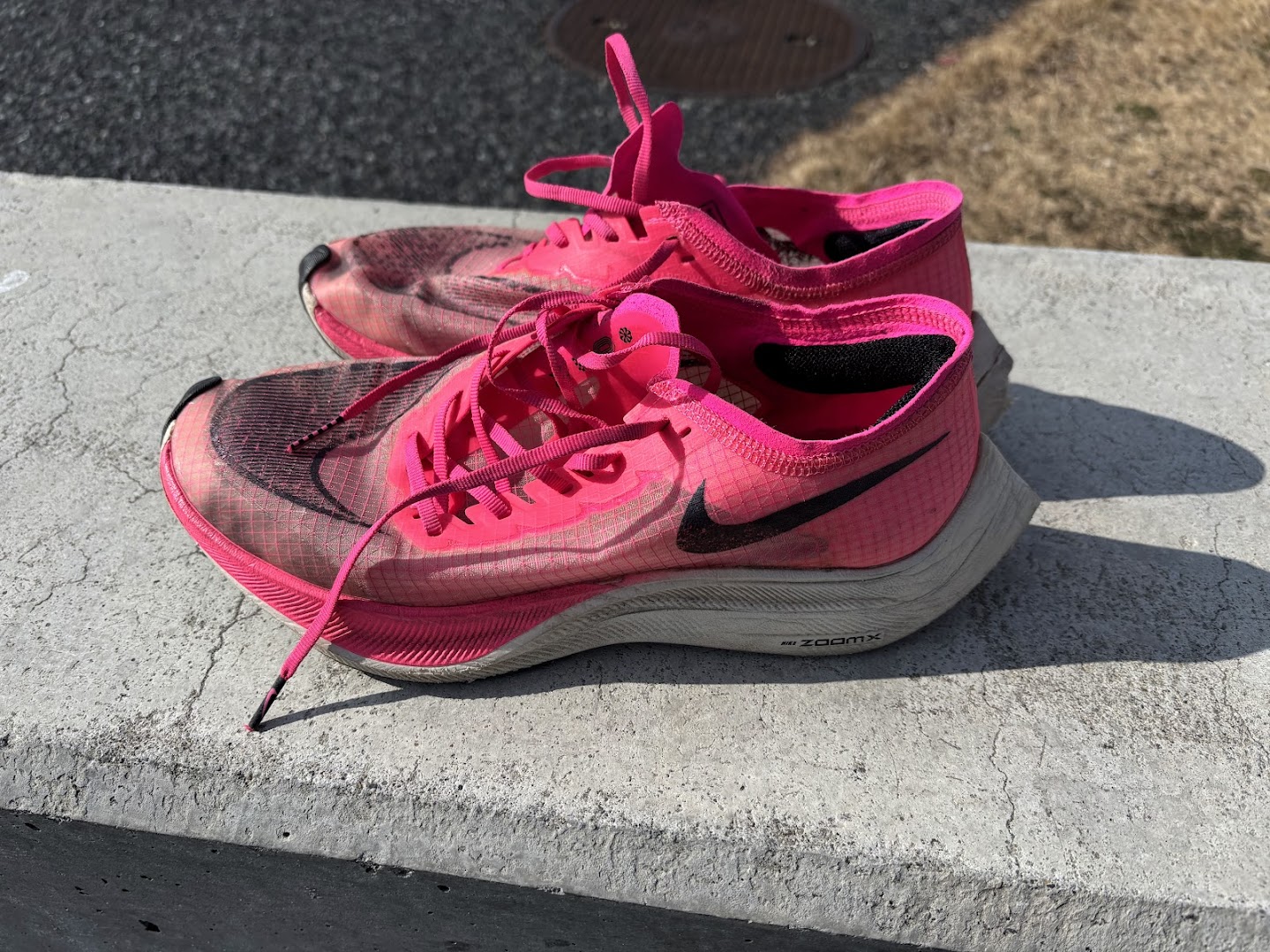 ・・・が結局これと言った対策をすることなく1週間が過ぎ、唯一の対策として思いついたのが、カーボンプレートと十分なクッションで、私の虚弱な脚の着地衝撃を和らげてくれると同時に、地面からの強い反発を得られるナイキの厚底シューズ「ナイキ ヴェイパーフライ」の着用。