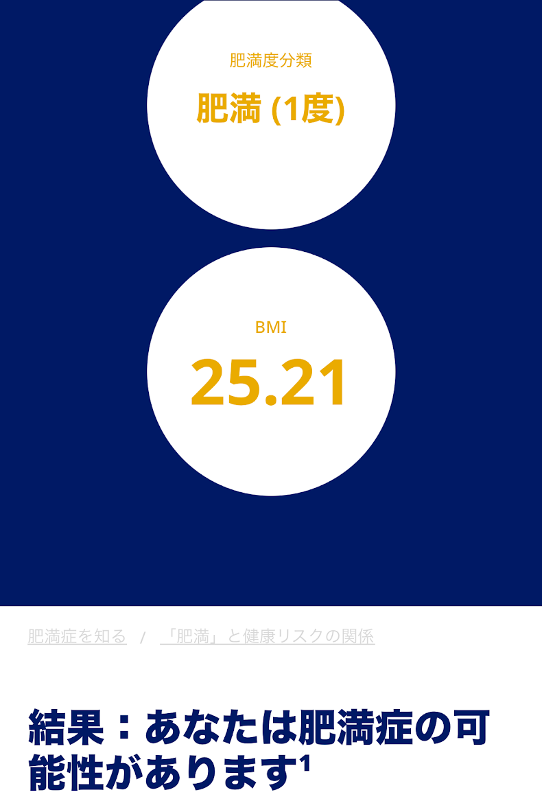 そしてふと思いつきでネットでたまたま見つけたBMI診断なるものをやってみると、見事に「肥満症の可能性があります」などというありがたいメッセージをいただく有様。
